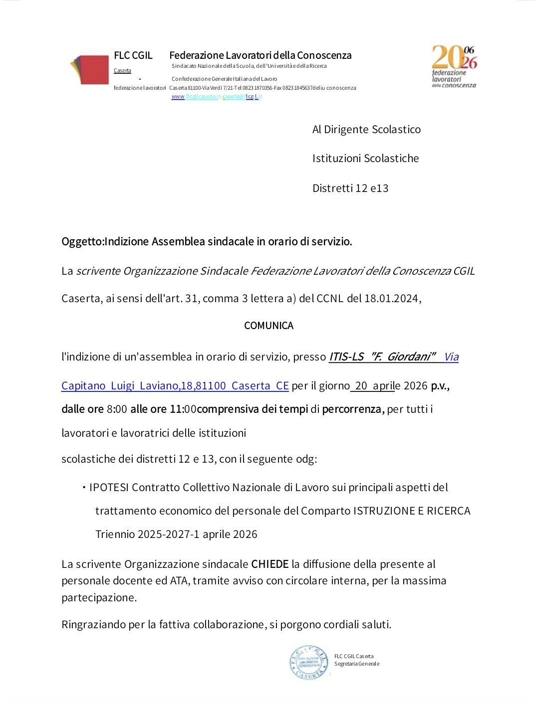 Indizione Assemblea sindacale in orario di servizio. L’Organizzazione Sindacale Federazione Lavoratori della Conoscenza CGIL Caserta, ai sensi dell'art. 31, com